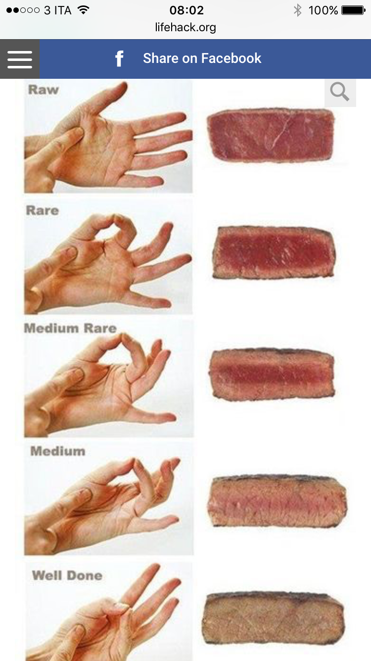 In pratica toccando la carne in cottura e successivamente il muscolo posto alla base del pollice (come sopra mostrato) potreste valutare il grado di cottura pur in assenza di termometro (anche se io ve lo consiglio!!!)
